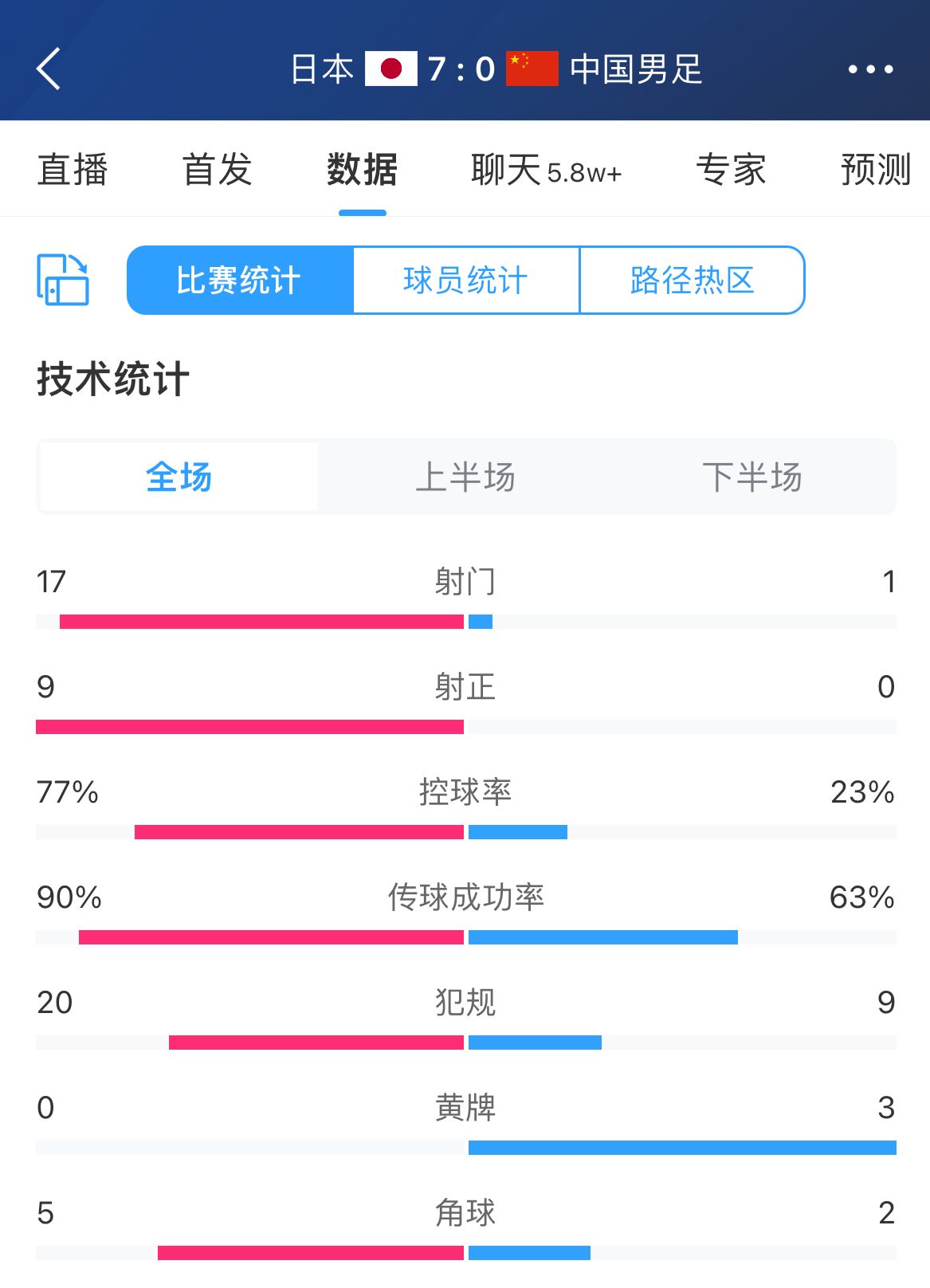 今晚会如何?国足客战日本数据:射门1vs17,犯规9vs20